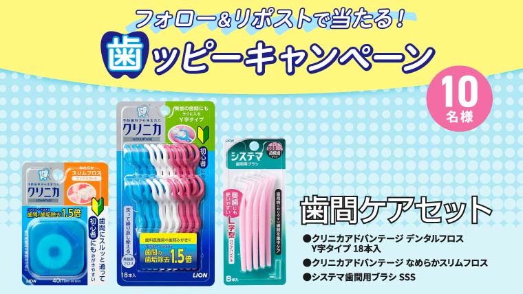 対象のX公式アカウントをフォローして、キャンペーン投稿をリポストすると、抽選で10名様に「歯間ケアセット」が当たる!
