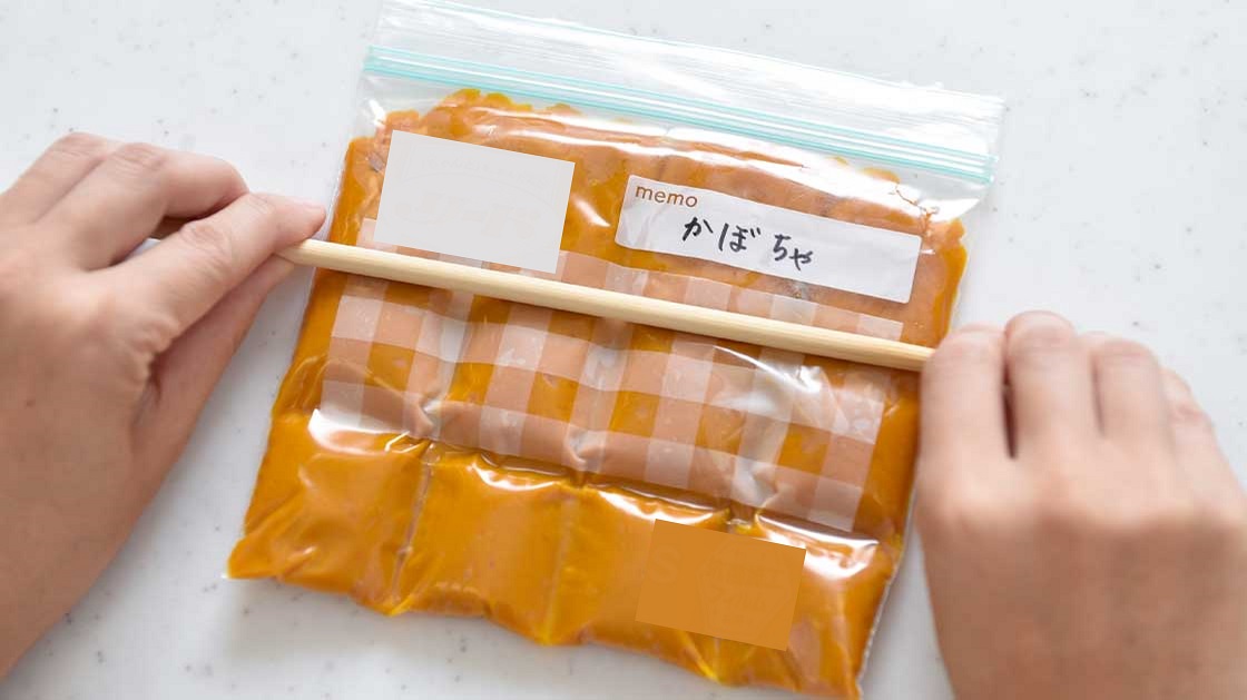 つぶした野菜を冷凍保存しておくのもおすすめ。電子レンジでチンしてつぶした野菜の粗熱がとれたら、保存バッグに入れて平らにし、空気を抜いてジッパーを閉じます。袋の上から、菜箸で1食分ずつになるように筋をつけて冷凍すれば、使う時に必要な分だけ折って使うことができます。