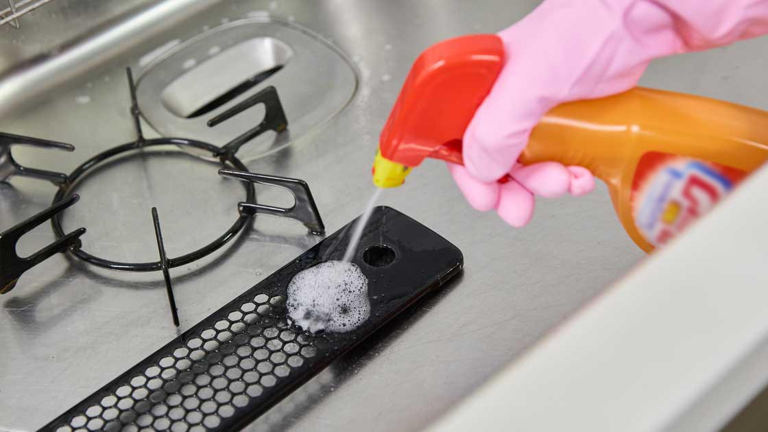 油汚れや焦げ付き汚れなど、ガンコな汚れを落とすには、レンジ用の洗剤が効果的。