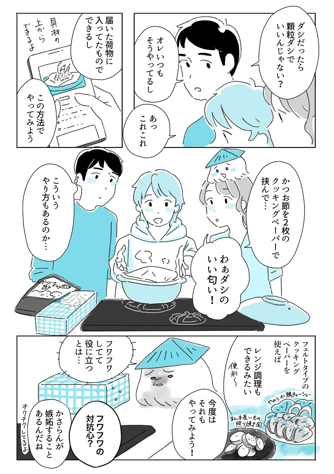 「オレとわたしと僕のくらし」第2話〜クッキングペーパーを使ってかんたんきのこ鍋〜