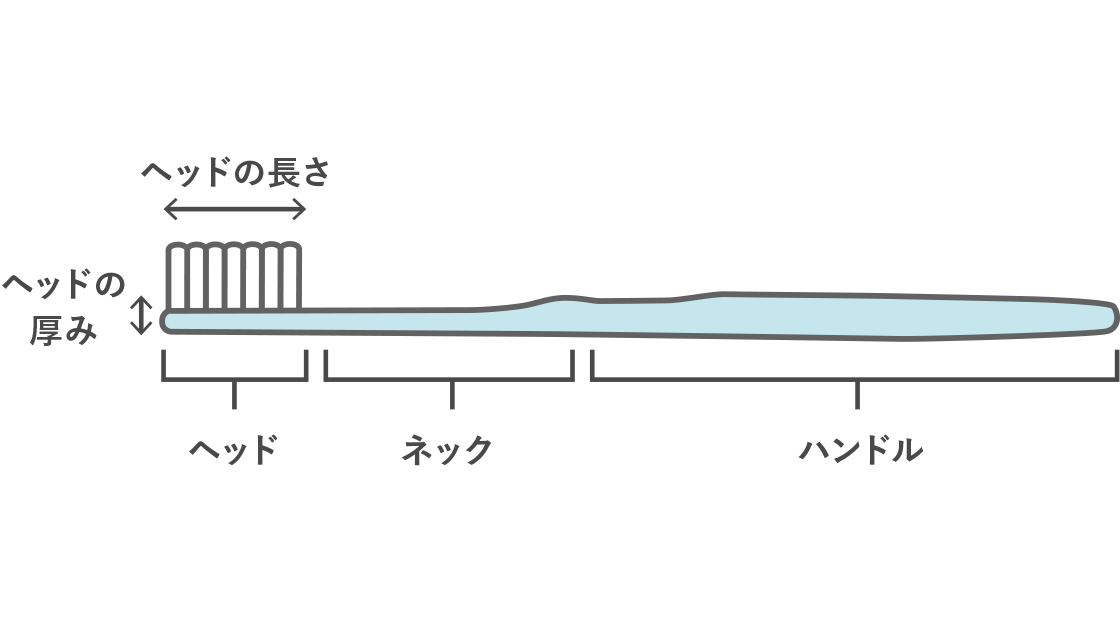 まずハブラシは「ヘッド(植毛部)」、「ネック」、「ハンドル」からなっています。ヘッドは大きさや形、毛の太さやかたさ、毛質が違います。ネックは長さやカーブの程度、ハンドルは太さやカラーなど特徴がそれぞれあるので、持ちやすさやお口の中への入りやすさで選ぶのもいいと思います。