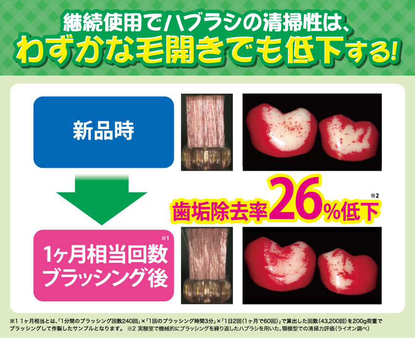 あと、ハブラシは1ヶ月に1本を目安に交換してくださいね。毛先が開くと効果的にプラークを落とせません。
