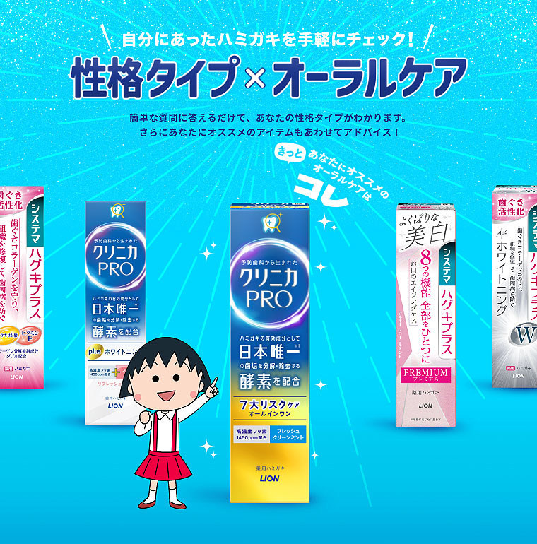 オーラルアイテムナビが『ちびまる子ちゃん』とタイアップしてリニューアル!自分にあったハミガキを手軽にチェック!簡単な質問に答えるだけで、あなたの性格タイプがわかります。 さらにあなたにオススメのアイテムもあわせてアドバイス!