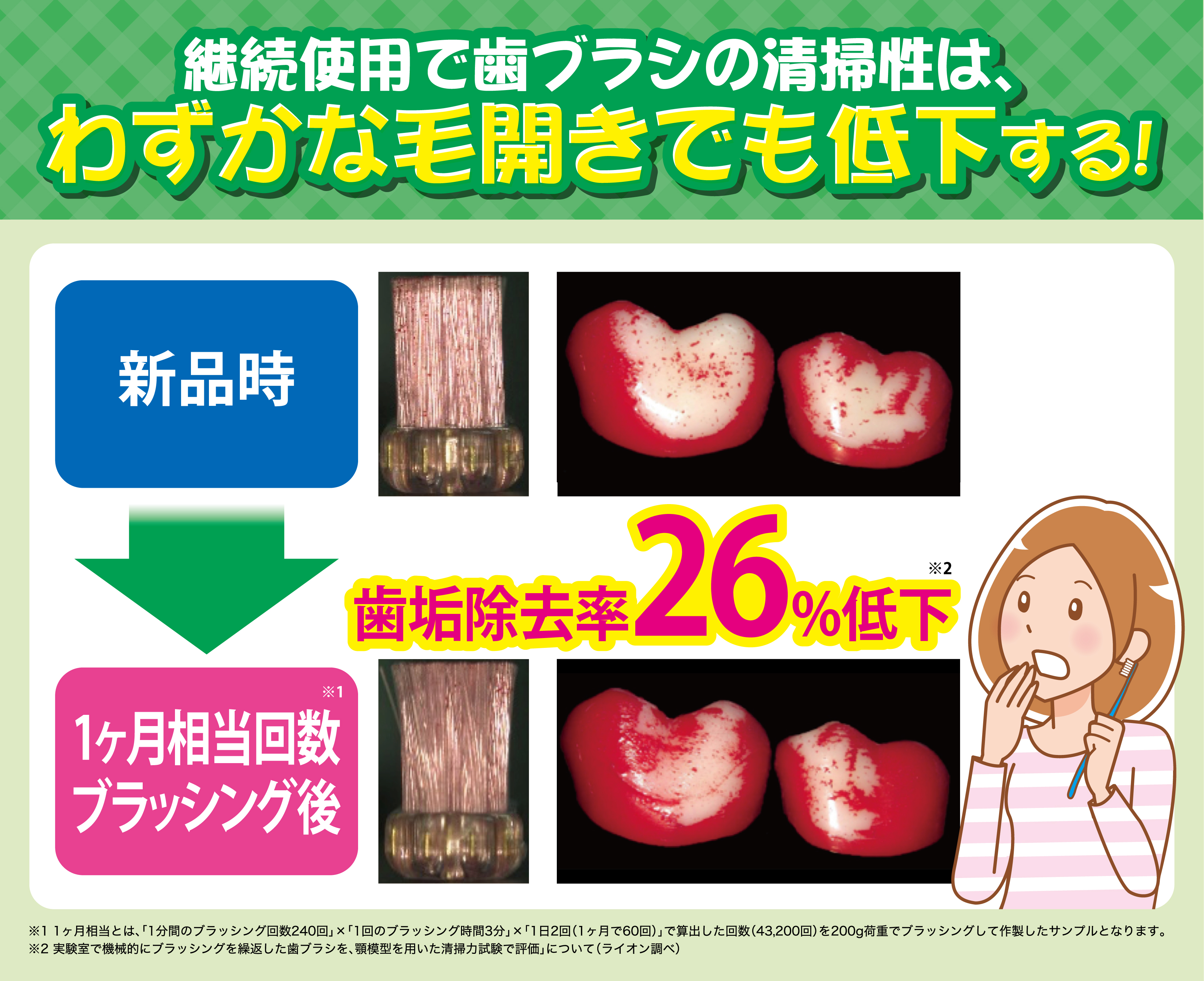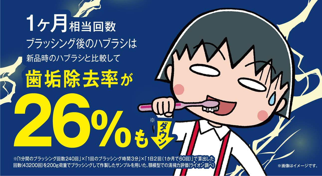 実は、1ヶ月相当使用したハブラシだと、歯垢を落とす力は新品と比べて約26%もダウンしてしまうというデータがあるんです