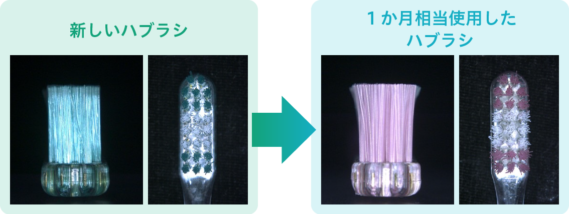 一見毛先が開いてないようにみえても、1か月使用すると毛開きしてしまい、汚れが溜まりやすい歯と歯の間や、歯と歯ぐきの境目に、肝心の毛先が届かなくて歯垢が残ってしまうんです
