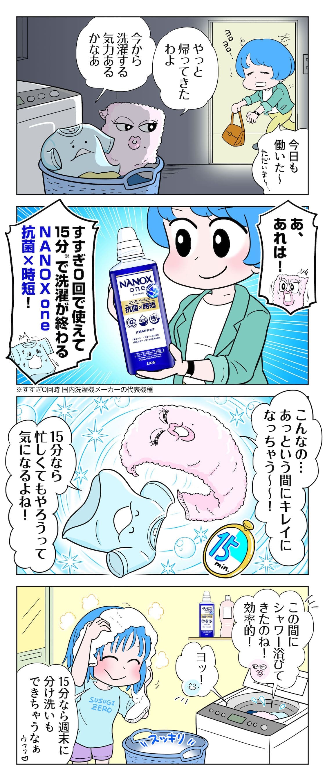 「高い洗浄・消臭力」と「衣類本来の色を保つ機能」を両立した唯一(※1)の洗濯洗剤『NANOX one』シリーズから、「NANOX one 抗菌×時短」が新登場!すすぎ0回で使える洗剤だから、15分(※2)で洗濯が完了します。これなら慌ただしい平日の夜でもサクッと洗濯をこなすことができるんです。おしゃれ好きだけど洗濯はちょっと苦手な会社員・すすぎレイコさんと、実は人間の気持ちや言葉がわかる洗濯物......ティーシャ&たおる子さんの日常を漫画家&イラストレーターのまずりんさんの4コマ漫画でお届けします。 (※1)当社衣料用洗剤内(※2)すすぎ0回時 国内洗濯機メーカーの代表機種