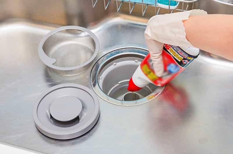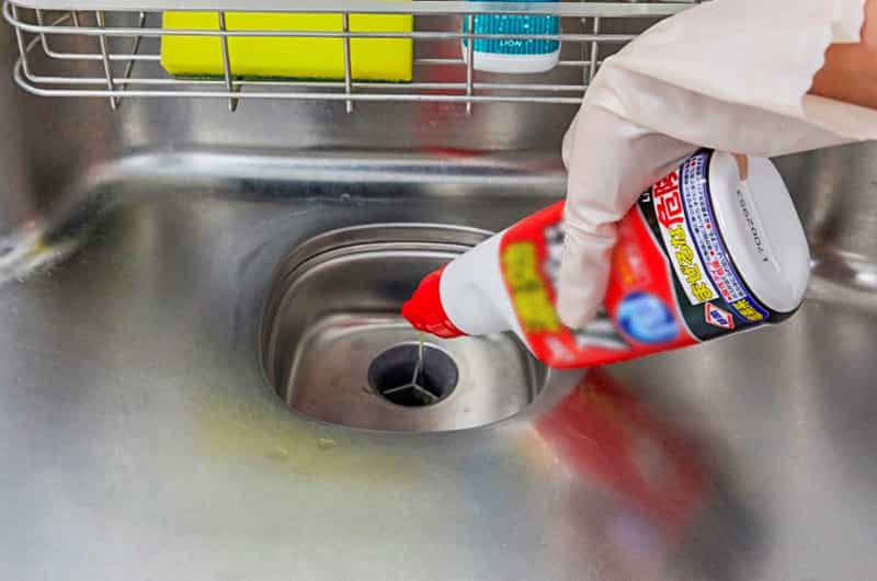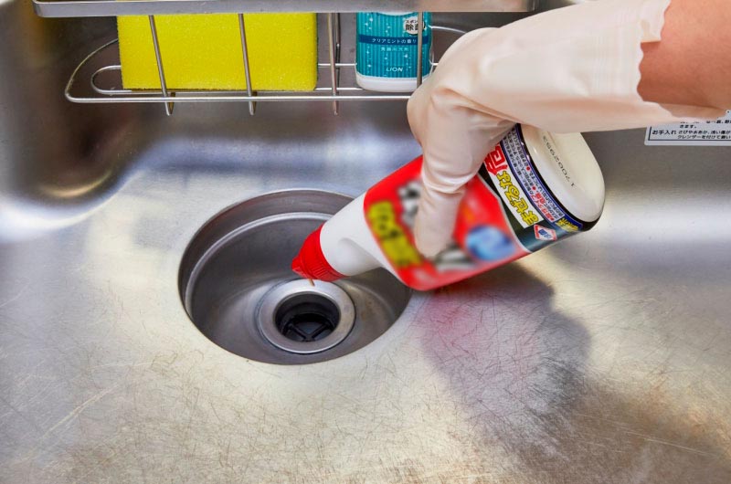 奥の排水パイプに液体のパイプクリーナーをかけ、しばらく置いてから水を流してすすぎます。長く置きすぎると、取れた汚れがたまって、かえって詰まりの原因になる場合もあるので、パイプクリーナーの表示に書いてある放置時間を守りましょう。