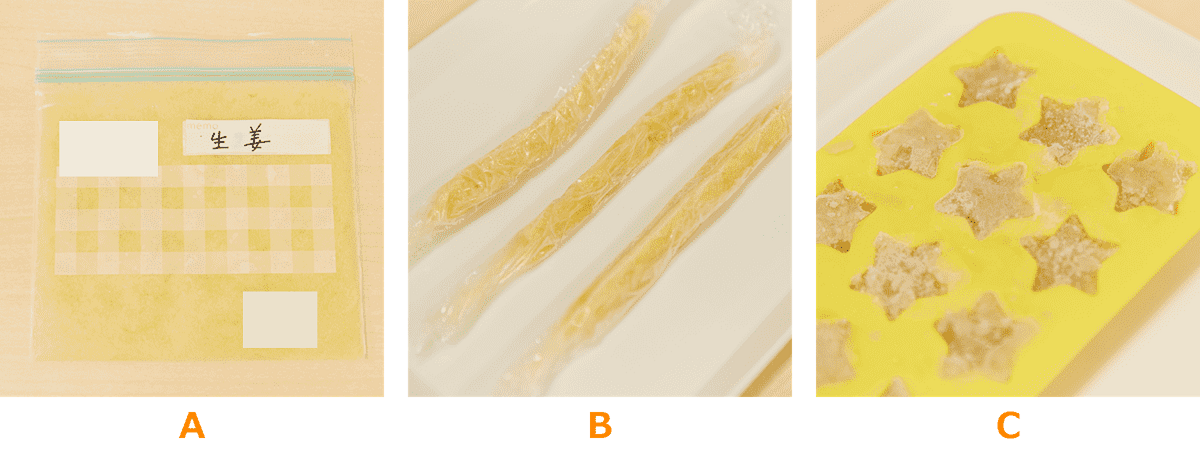 C:小さめの製氷皿を使って小分けにしてから、ジッパー付き保存バッグに入れて冷凍