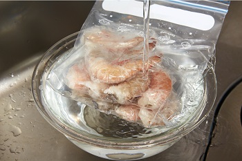 ジッパー付き保存バッグのまま流水にさらし、解凍する方法です。食材に直接水が触れると、風味や栄養を損なうことがあるので、注意しましょう。
