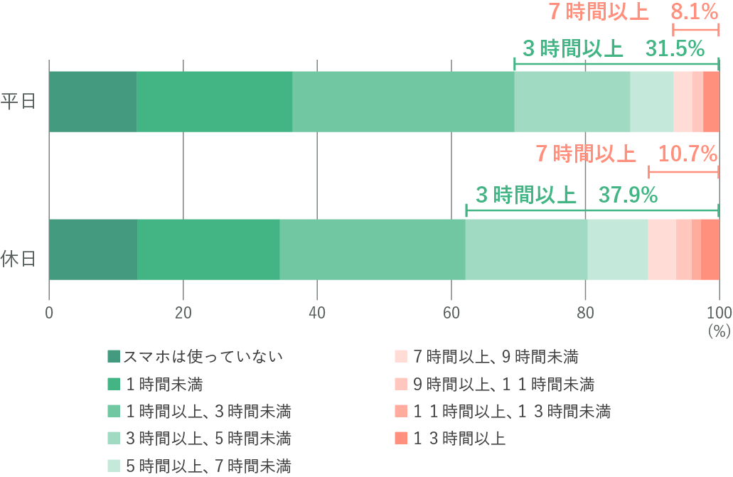 若い世代はおおむね使用時間が長くなっています。次のグラフは学生のスマホ使用時間ですが、平日は3時間以上使用する人が約7割、7時間以上使用する人が約2割でした。