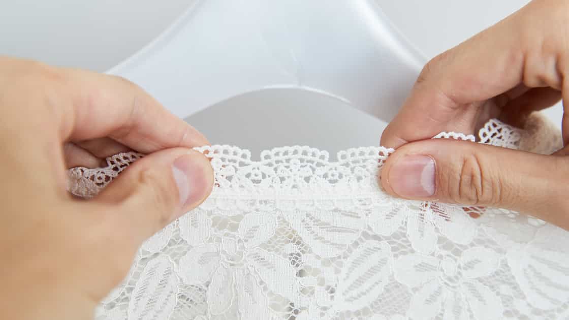 ニット+ファーの異素材ミックス衣類と異なる点は、干し方です。脱水した後は、しわになるのを防ぐため、すぐにハンガーを使って屋内または日陰で「吊り干し」をしましょう。色物は色あせの原因となる可能性があるので、直射日光には当てないでください。縮んだり、形がくずれたりするレースの編み目を「指先アイロン」で整えながら、しわを伸ばします。
