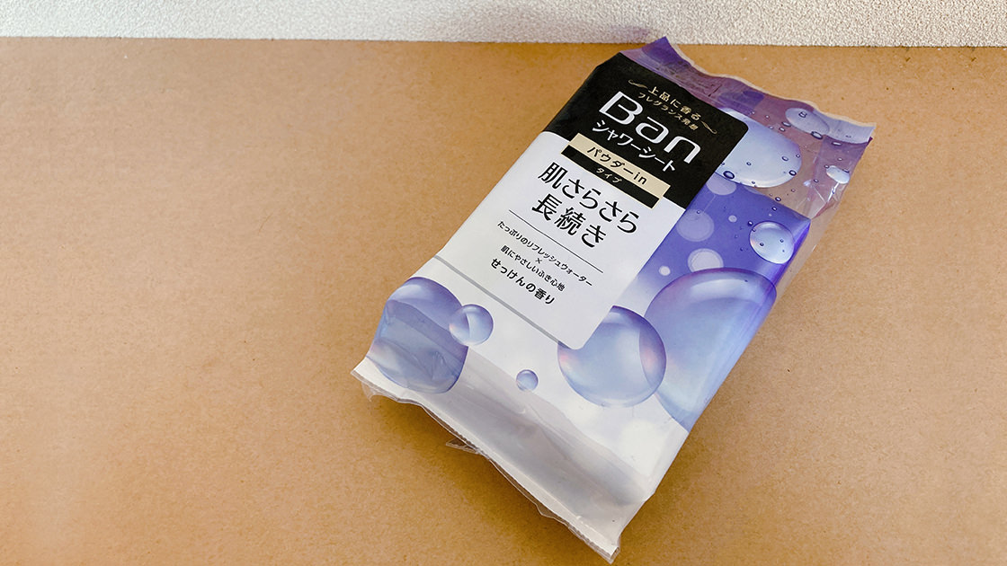 汗をかいたあと、背中や首筋などの範囲の広い部分を「Banシャワーシート パウダーinタイプ」でふき取ります。さっぱりした使い心地で、めっちゃ気持ちいい!筋トレしたあとはもちろん、普段からも持ち歩きたいですね。