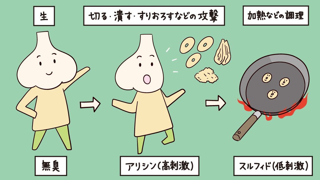 アリシンは、タマネギやニラなどユリ科の野菜に含まれています。なかでも、にんにくはアリシンを豊富に含む食材です。アリシンそのものは刺激が強いのですが、加熱したり、油とあえたり調理することで、「スルフィド」という刺激が少ない成分に変換されます。このスルフィドが、旨味成分であると同時に、様々な健康機能を担っているんですよ。