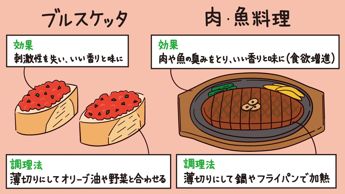 すりおろしたにんにくをオリーブオイルや野菜とあえるブルスケッタやガーリックステーキはおすすめですね。にんにくの香りが増して、食欲が増進されますし、肉や魚の臭みも取り除いてくれます。