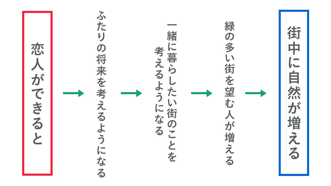 例えば、「恋人ができると」→ふたりの将来を考えるようになる→一緒に暮らしたい街のことを考える→緑の多い街を望む人が増える→「街中に自然が増える」みたいにするとよりサステナブルじゃないですか?