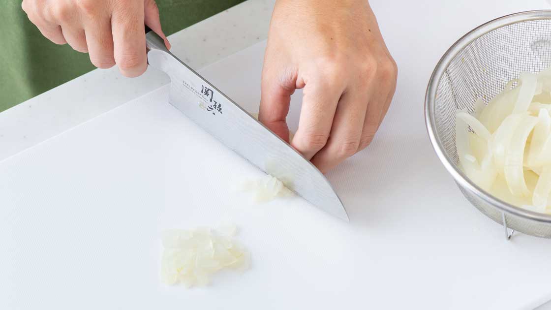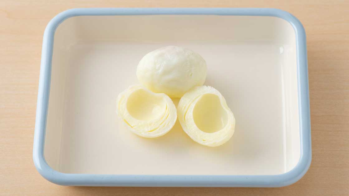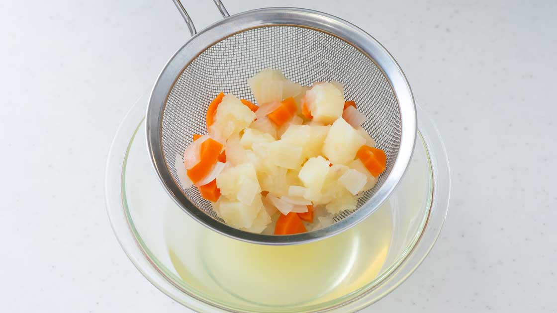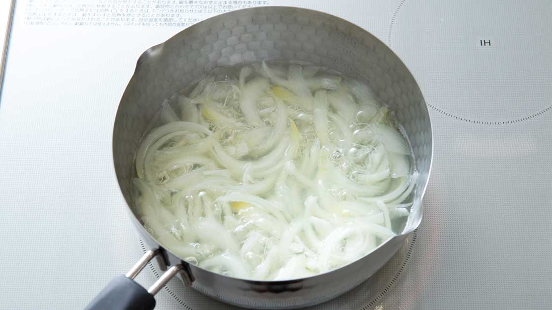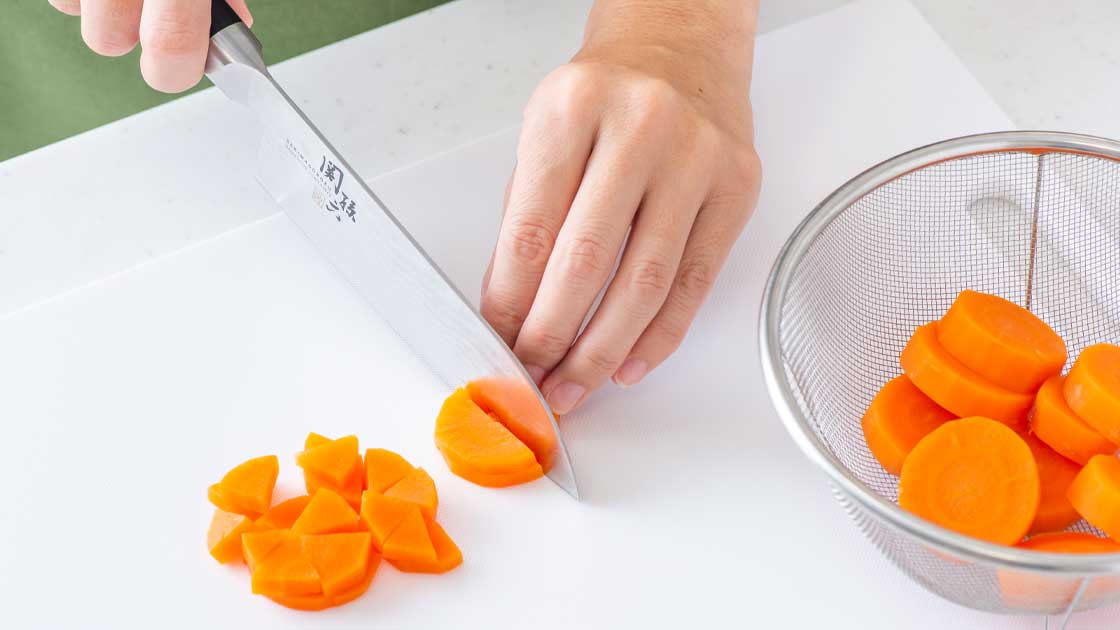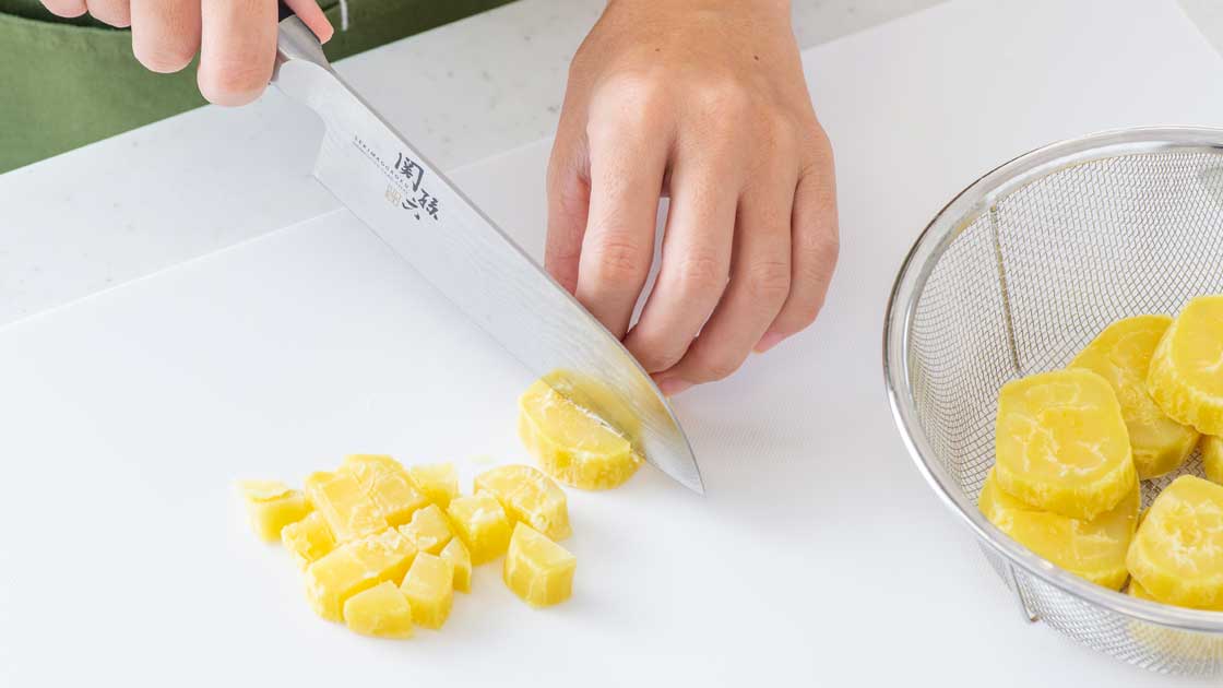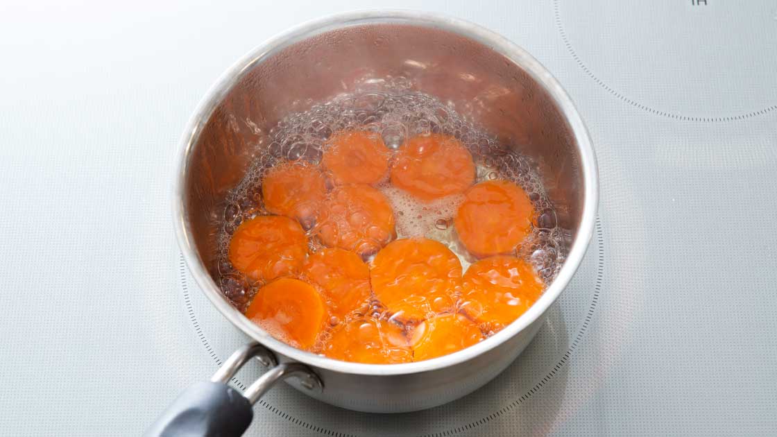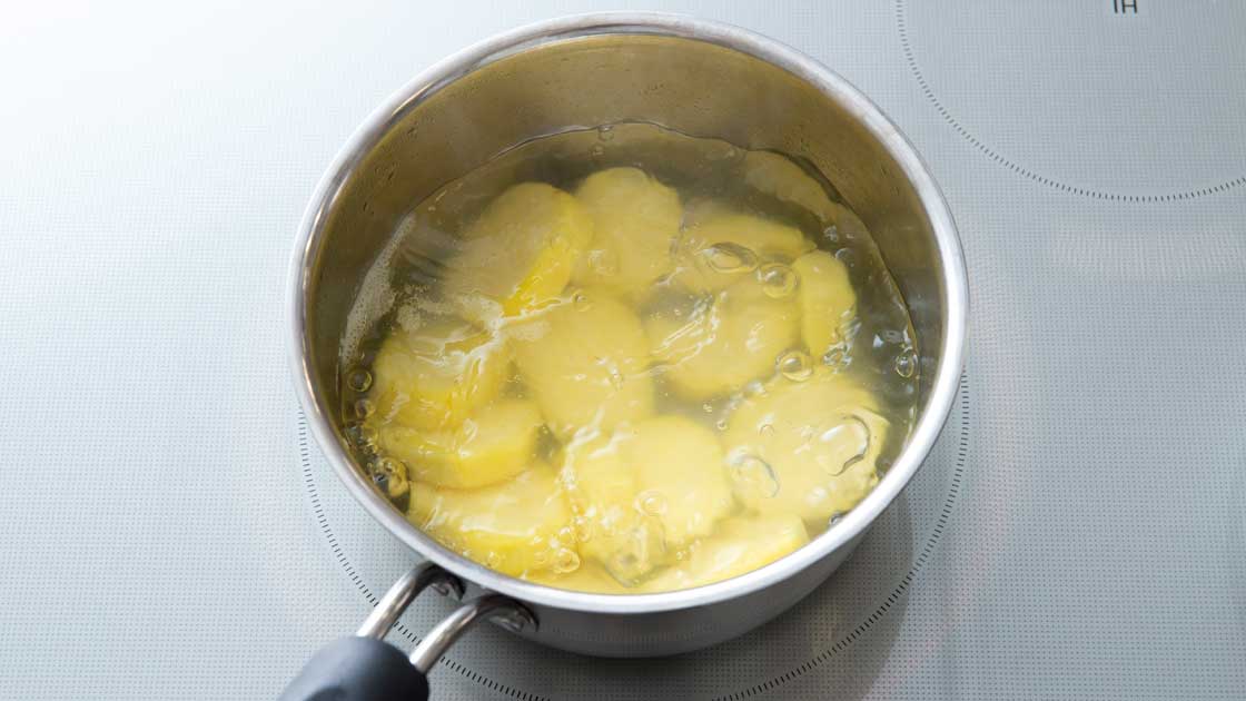 皮をむいて1㎝厚さに切り、水からじっくり、やわらかくゆでます。細かく刻んでからゆでるよりも、大きめのサイズでゆでるほうがやわらかくなります。