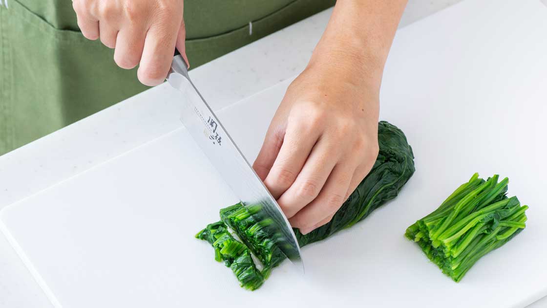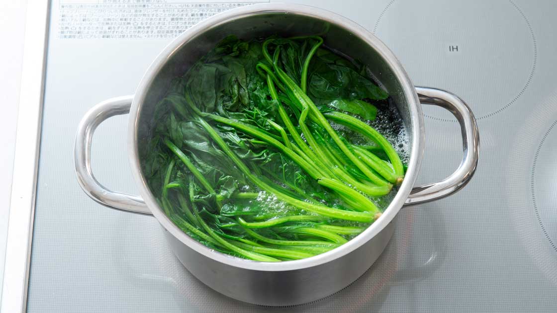 えぐみの原因になるシュウ酸を除くために、たっぷりの湯でゆでてから、水に浸し、そのあと水気をしぼります。初期、中期はやわらかい葉先のみを使いましょう。