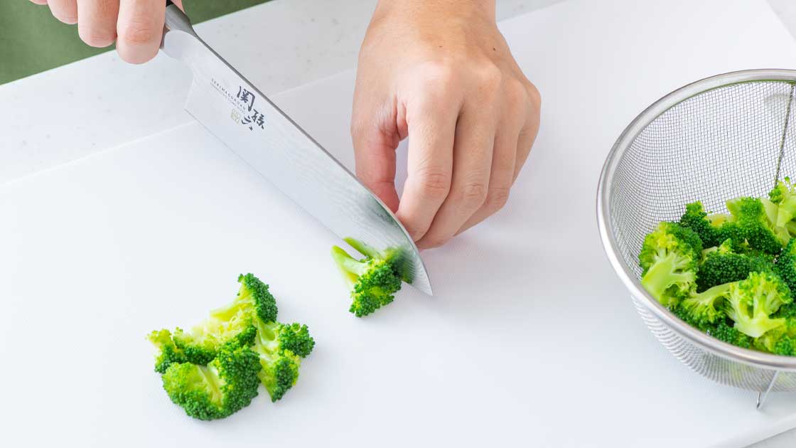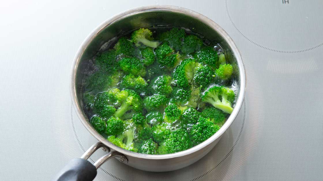 小房にしたものをやわらかくなるまでゆでます。初期、中期は穂先のやわらかい部分のみを包丁でそぎ取って使います。