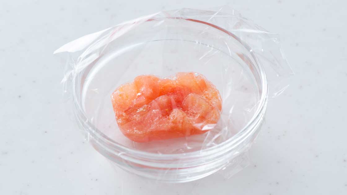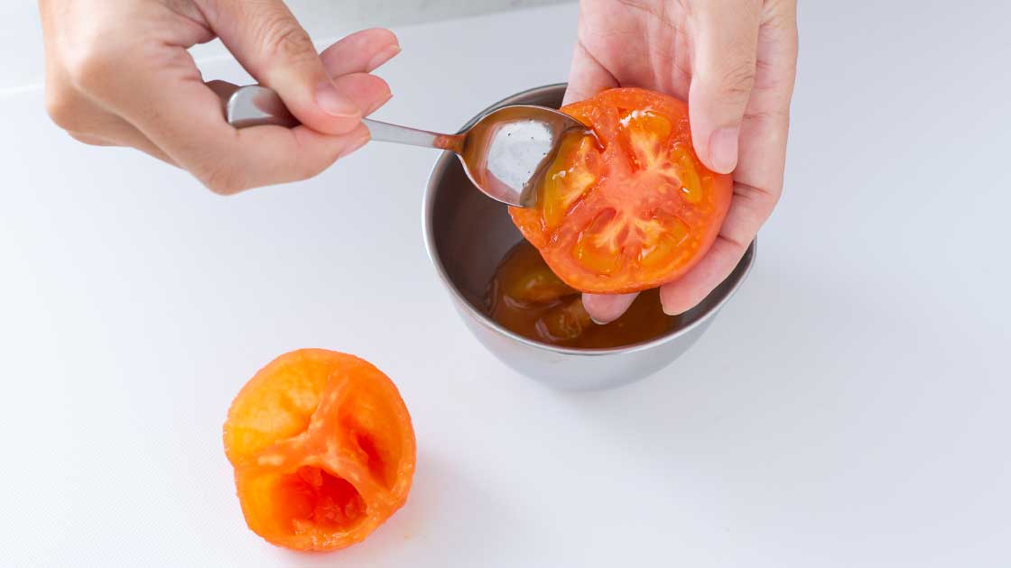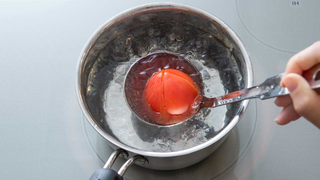 皮に浅く十文字の切り目を入れて熱湯にくぐらせ、皮がめくれてきたら、冷水にとって皮をむきます。横半分に切って、種を取り除きます。