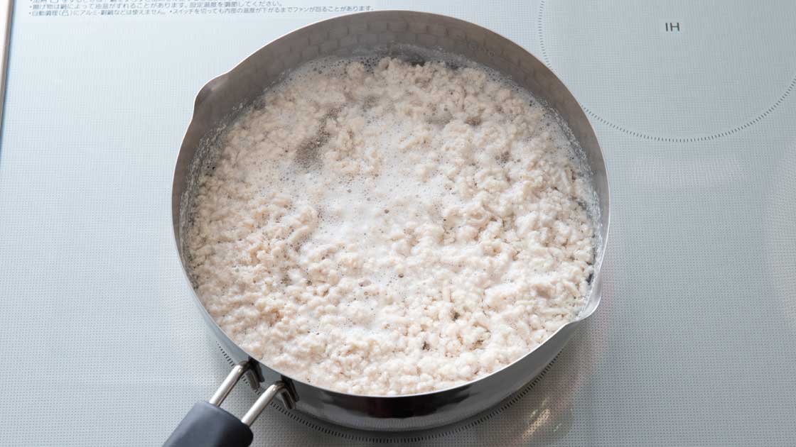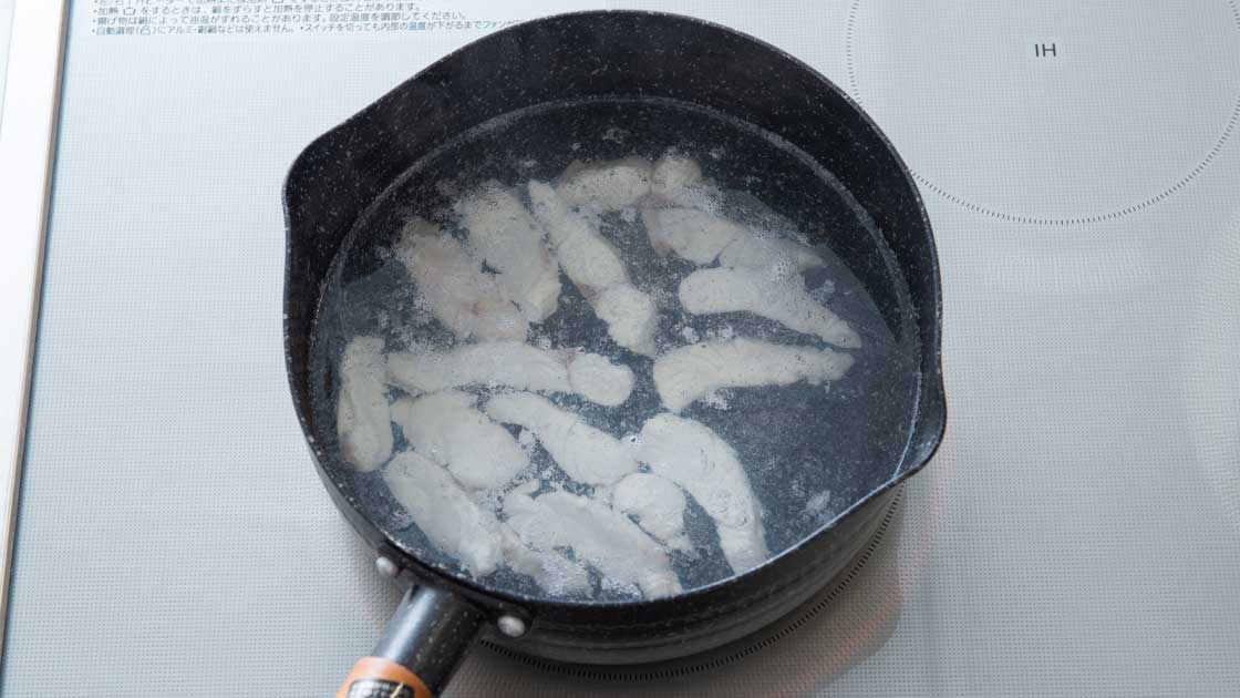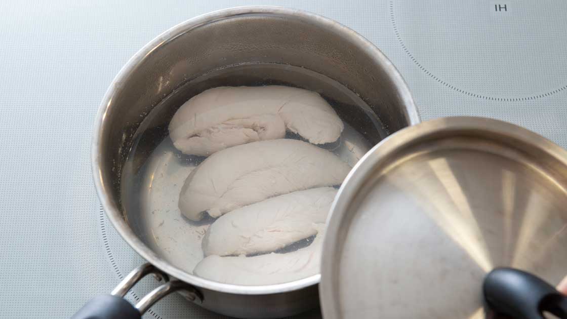 鶏ささみの筋を取って鍋に入れ、かぶるくらいの水を加え、中火にかけます。沸騰したら弱火にして1分ほど加熱し、火を止め、フタをして15分ほど蒸らします。加熱しすぎるとかたくなるので、余熱で火を通すのがおすすめ。蒸らしたあとは、中まで火が通っているか確認します。