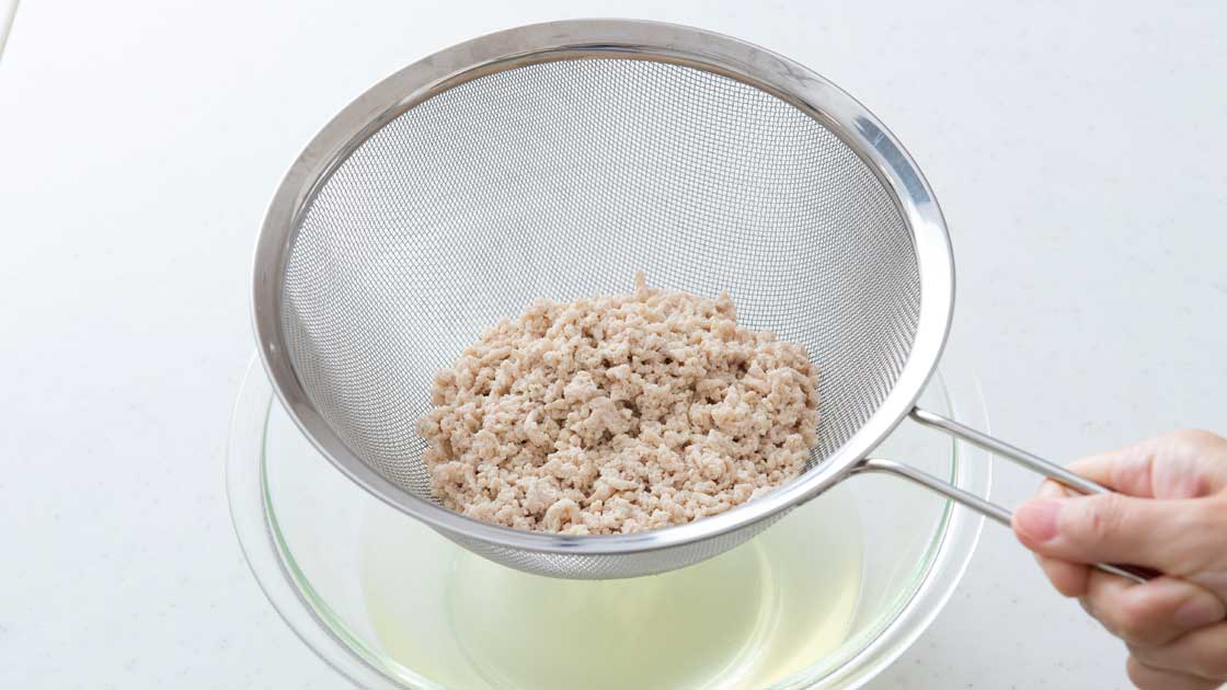 さっとゆでて、そぼろにします。ゆで汁も鶏スープとして活用できます。鶏ひき肉に慣れたら、後期は牛ひき肉や豚ひき肉でも、同様に下ごしらえして食べられます。