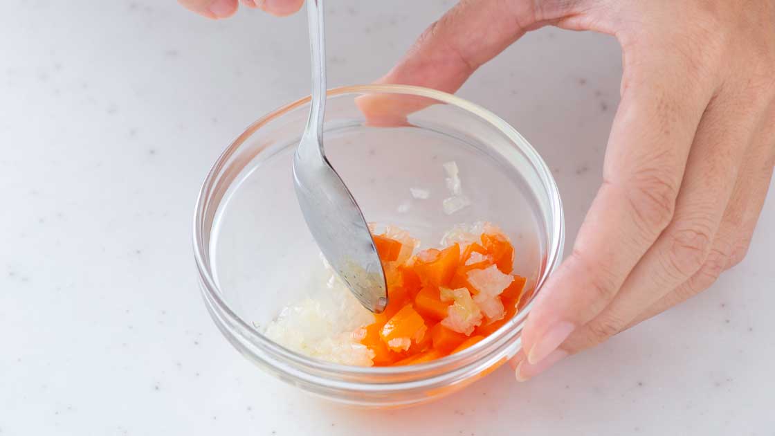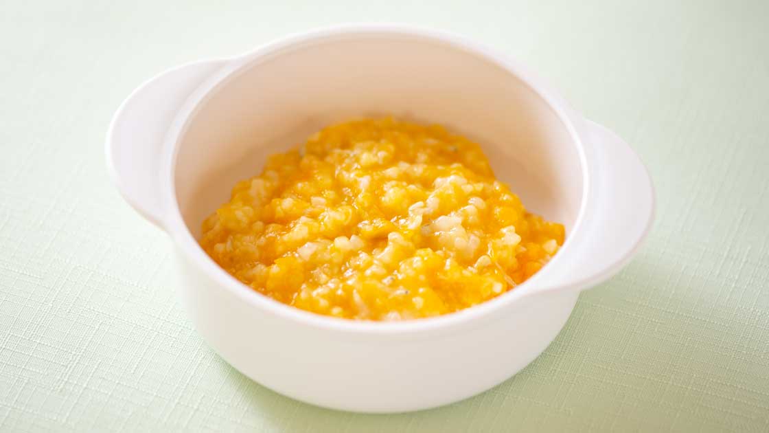 耐熱ボウルに、凍ったままのかぼちゃ20g、5倍がゆ70gを入れます。水大さじ1を加え、ふんわりとラップをかけ、電子レンジ600Wで2分加熱します。