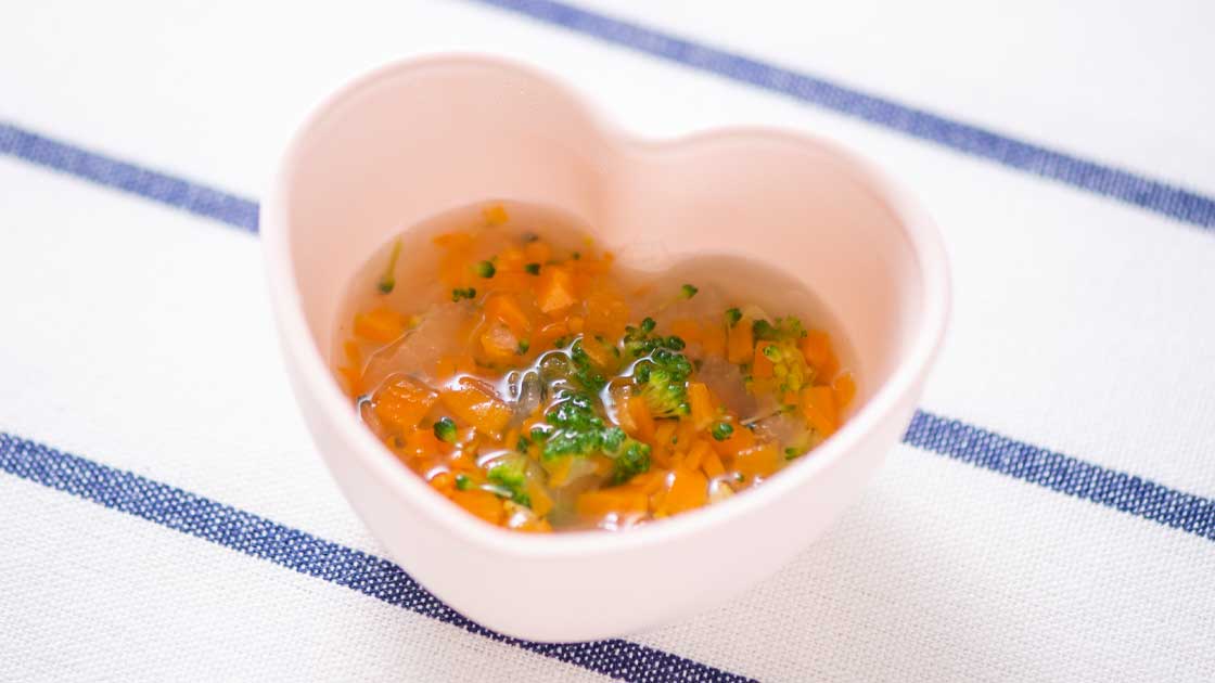 耐熱ボウルに、凍ったままのにんじん・大根・ブロッコリーなど計15gと、野菜だし大さじ1を入れます。ふんわりとラップをかけ、電子レンジ600Wで1分加熱。野菜のうまみたっぷりの1品に!