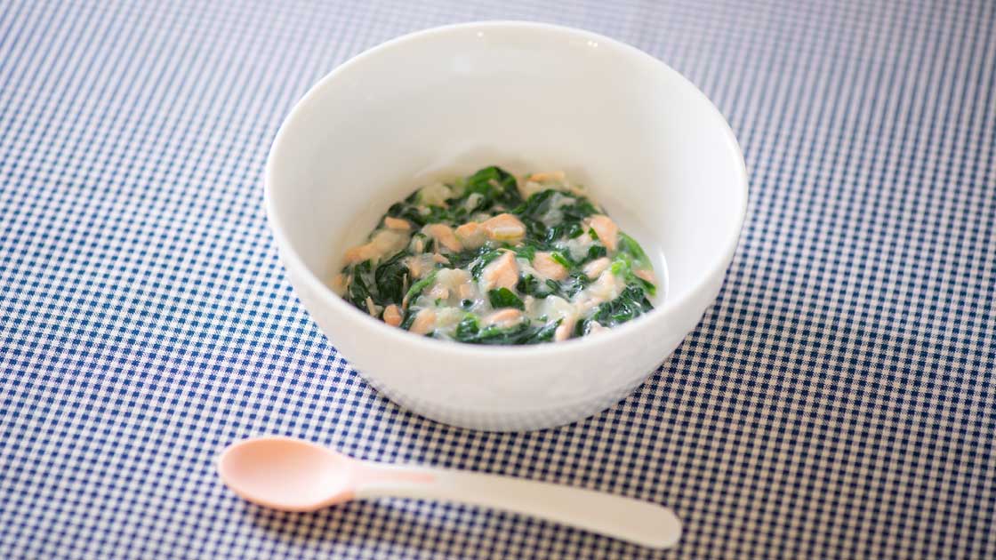 耐熱ボウルに、凍ったままのサケ15g、ほうれん草20g、玉ねぎ10gを入れ、ふんわりとラップをかけ、電子レンジ600Wで1分加熱します。お湯で溶いた市販の離乳食用のホワイトソースを混ぜて、クリーム煮の完成!