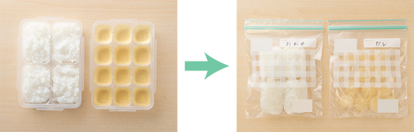 衛生や鮮度キープのためにも、食べる分だけを取り出すことは大切。おかゆや野菜をキューブ状に冷凍できるフリージングトレーや、冷凍OKの食品保存用ジッパー付きバッグに入れておくと、1回量を取り出しやすいので便利です。