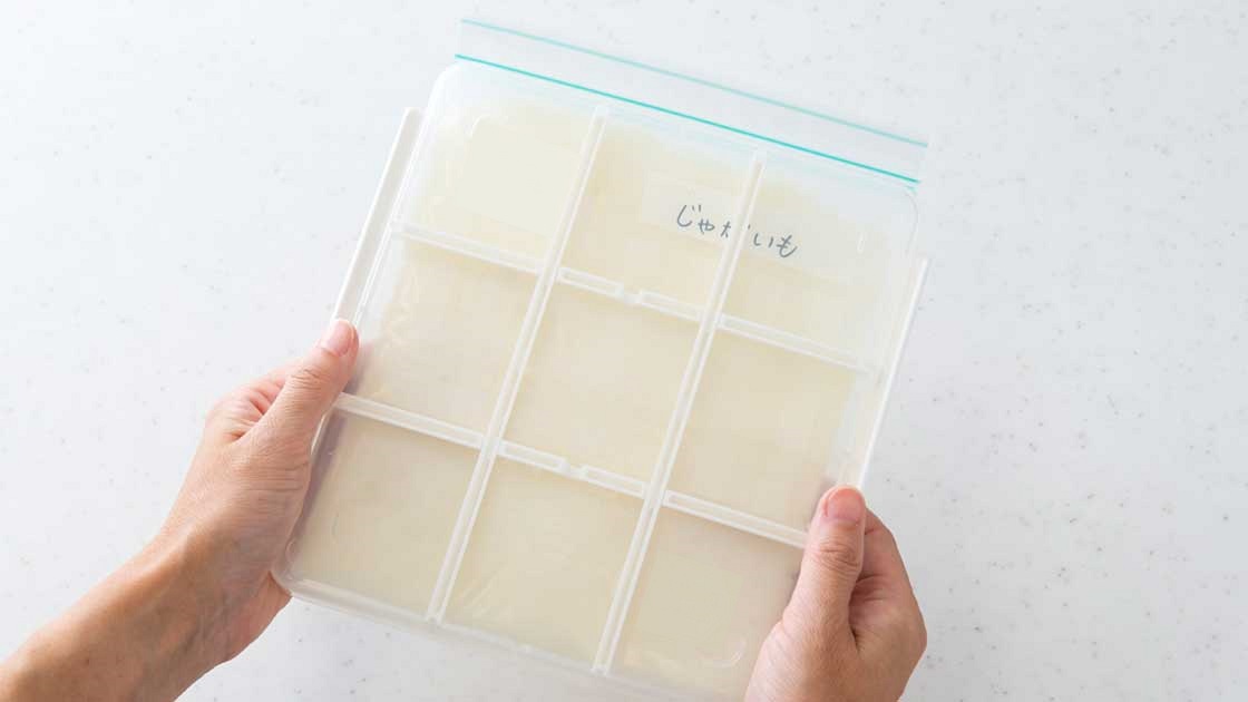 いも類やかぼちゃは、ゆでたあとにマッシャーなどでつぶし、かたい場合は湯冷ましを加えてかたさを調節します。保存バッグに平らに入れ、菜箸で筋をつけて冷凍すれば、1回分を折って取り出せます。