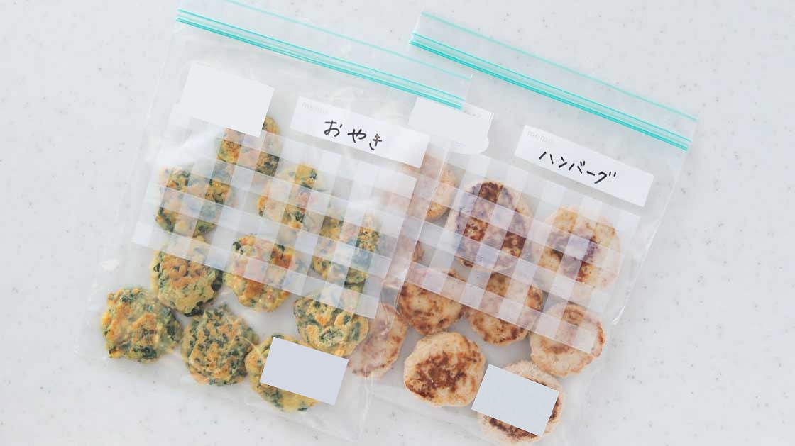 手づかみで食べるようになる後期以降は、お焼きやハンバーグなどを焼いて仕上げた「完成形」を保存バッグで冷凍しておくと、加熱してそのまま食べさせられて大助かり!