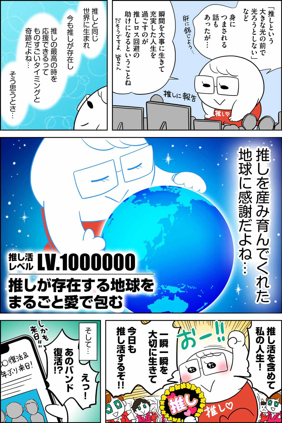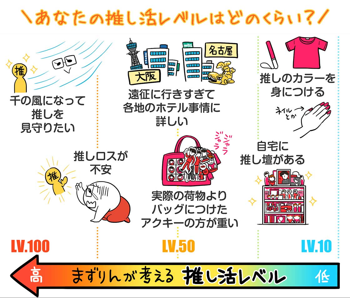 ヒイイイ…それは想像しただけでつらい!だけど経験していないと理解しづらい感情なのでしょうね。そもそも推しがいる人たち同士でもスタンスは同じじゃないですし、どれくらいのパワーで推しているかも人それぞれですし…。ちなみに私は今、下の表でいうところのLV.100にまもなく到達しそうな勢いです。