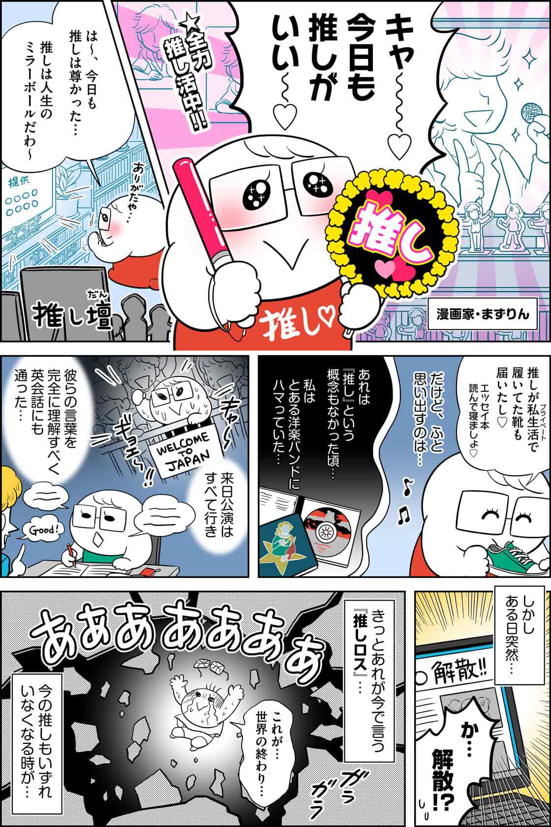 全力で応援している「推し」の一挙一動が、生活に及ぼす影響は計り知れないもの。そう感じている人は少なくありません。漫画家&イラストレーターのまずりんさんも、そのひとり。でも、だからこそ不安になるのが推しロスのこと。もしも大好きな推しが引退してしまったら...?考えたくないことだけど、そうなる前に立ち直り方や予防策を知っておきたい!精神科医の名越康文さんに教えていただきました。