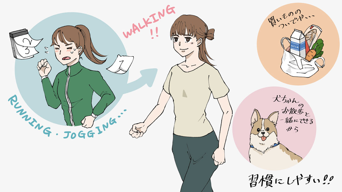 ウォーキングは関節への負担が少なく、継続しやすい有酸素運動です。