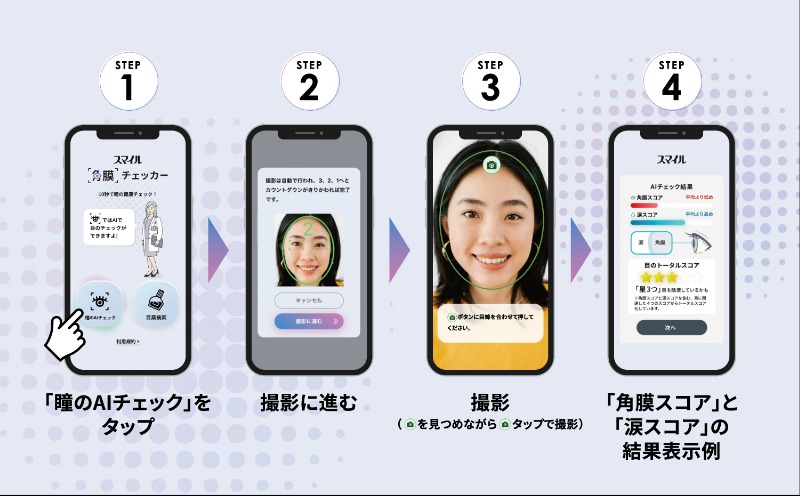 菅原さん(以下、菅原):こちらこそどうぞよろしくお願いします。角膜チェッカーはAIを使って10秒で瞳の健康をチェックできるツールです。サイトの「瞳のAIチェック」ボタンをタップして、スマホで顔を撮影するだけで、AIが瞳を自動で検知し角膜と涙の状態をスコア化してくれます。