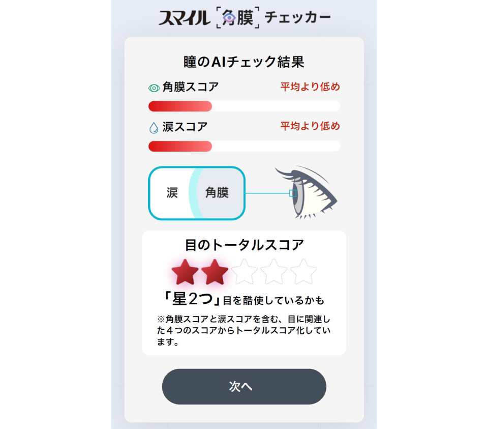 編集部:私も試しにやってみたのですが、本当に簡単でした。しかも結果には「角膜スコア」と「涙スコア」の両方が出てきて、さらに総合的なスコアを「星いくつ」で示してくれるのですよね。