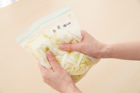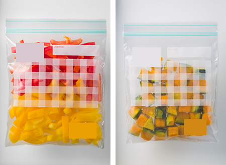 野菜は洗ってから使いやすい大きさに切り、保存バッグに入れて密閉しておけば、シャキシャキの鮮度とおいしさをキープでき、サッと使うことができます。加熱に時間がかかるかぼちゃやにんじんなどは、カットしたあと、ぬらしたクッキングペーパーで包んで電子レンジでチンしてから保存しておくと、いろいろな料理にスピーディにアレンジできて、とても便利です。