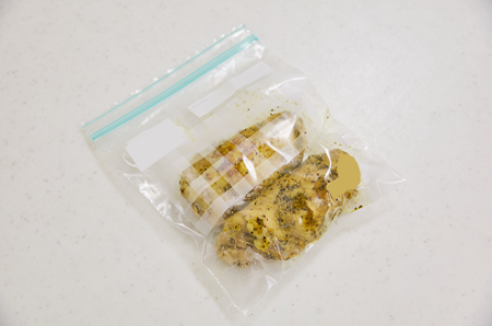 (5)鶏肉のクッキングペーパーをはずして保存バッグに入れ、Bを振ってからめて、しっかりと口を閉じて保存する。