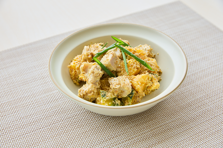 2cm角に切り、ぬらしたクッキングペーパーで包んで電子レンジで加熱したかぼちゃ1/8個分(135g)と、角切りにした鶏肉のスパイスロール1/4本に、きざみ白ごま大さじ2、マヨネーズ大さじ3、塩、こしょう各少々を加えてあえる。細く斜めに切った万能ねぎをトッピング。
