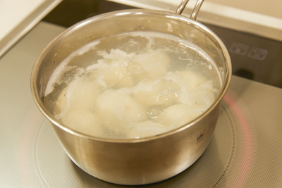 里芋は、上下の先端を切り落とし、皮つきのまま鍋に入れ、里芋がかぶるくらいの水を入れ火にかけます。沸騰したら中弱火にし、ふきこぼれないように注意しながらゆでます。