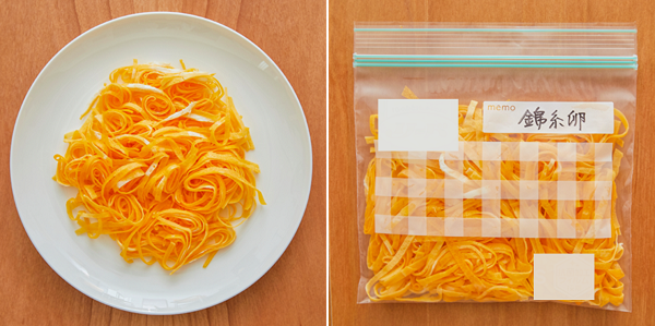 ●作り方と保存方法 卵3個をよく溶きほぐし、お好みで塩少々を加え、よく混ぜる。油を薄くひいて熱したフライパンに1枚分の卵液(直径26cmのフライパンなら、おたまに軽く1杯。卵1個分くらい)を入れ、フライパンを回しながら薄く広げる。両面を焼き、取り出す。冷めてから細切りにして、ジッパー付き保存バッグに平らに広げて入れて冷凍。