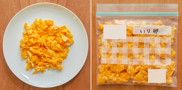 ●作り方と保存方法 卵3個を溶きほぐし、お好みで塩少々を加えてよく混ぜる。油を熱したフライパンに全量を流し、菜箸でかき混ぜながら焼く。火が通ったらフライパンから取り出してよく冷まし、ジッパー付き保存バッグに平らに広げて入れて冷凍保存。