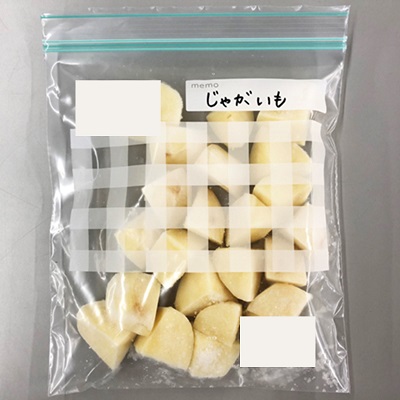 生のじゃがいもの皮をむいて切り、ジッパー付き保存バッグに入れて冷凍保存してみました。これを使って調理をすると、カレーを温めた時のように一気にボロボロとくずれることはありませんでした。