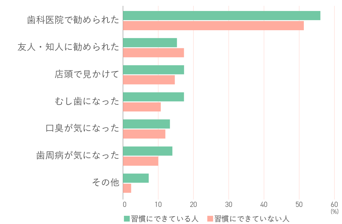 まず、デンタルフロスを使用したきっかけについて聞きました。その結果、習慣にできている人、できていない人、どちらもおよそ50%以上の人は「歯科医院ですすめられた」のがきっかけでした。以下、友人・知人にすすめられた、店頭で見たと続きますが、習慣にできている人とできていない人の間に大きな違いはありませんでした。