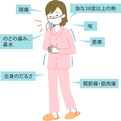 インフルエンザの「症状」は、風邪と比べて重く、1~3日の潜伏期間を経て、寒気や悪寒を伴う38~40度の高熱、全身のだるさなどが急激に現われます。また頭痛や関節痛・筋肉痛といった全身の痛みがある、肺炎や気管支炎などの合併症が出やすいという特徴があります。時として、神経系の合併症である熱性けいれん、脳炎、脳症などを引き起こすこともあります。