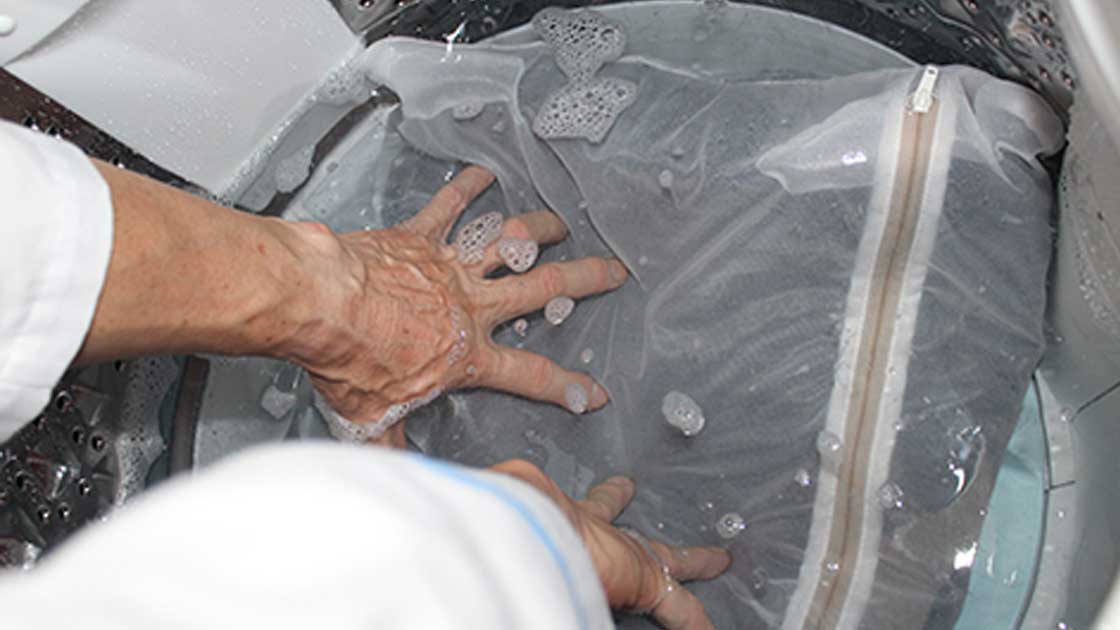 手洗いする。洗濯機を使う場合は、洗濯機メーカーの情報を確認して「手洗いコース」「ドライコース」などのやさしいコースで洗う。液温は30℃以下を推奨 | |