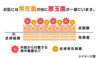 私たちには、外部から侵入しようとする細菌などから、からだを守る機能が備わっています。手のひらなど皮膚の表面には「常在菌」と呼ばれる菌が存在し、それらの働きによってバイ菌の増殖や侵入を防いでいます。その「常在菌の働き」を、ライオンでは皮膚の「バイ菌バリア」と呼んでいます。