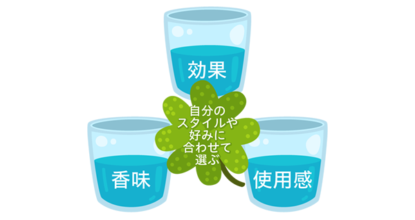店頭にはいろんな「デンタルリンス」「マウスウォッシュ」が並び、どれを選べばいいのか、迷ってしまう……。そんな時は、「効果」「香味」「使用感」の3つをポイントに、自分のスタイルや好みに合うものを選ぶのがおすすめです。