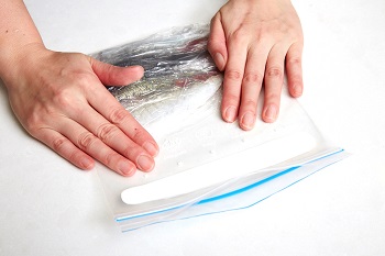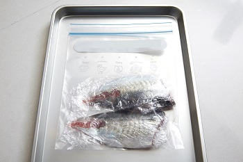 「丸ごとの魚」は「内臓(わた)」や「えら」から傷みが進むといわれています。内臓やえらを取る「下処理」をして、よく洗い、クッキングペーパーで水気をふき取ってから保存しましょう。また、イカやエビも「下処理」をしてから冷凍します。