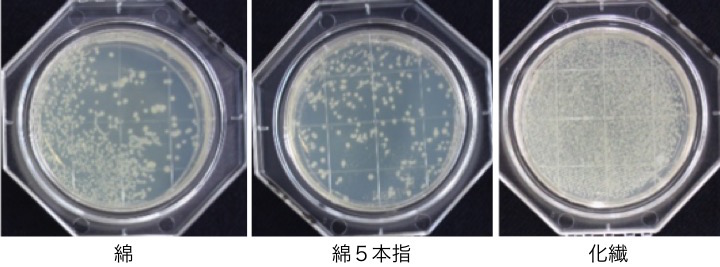 その結果、「綿5本指」の靴下には菌が少なく、「化繊」の靴下には最も多く菌が見られました。
